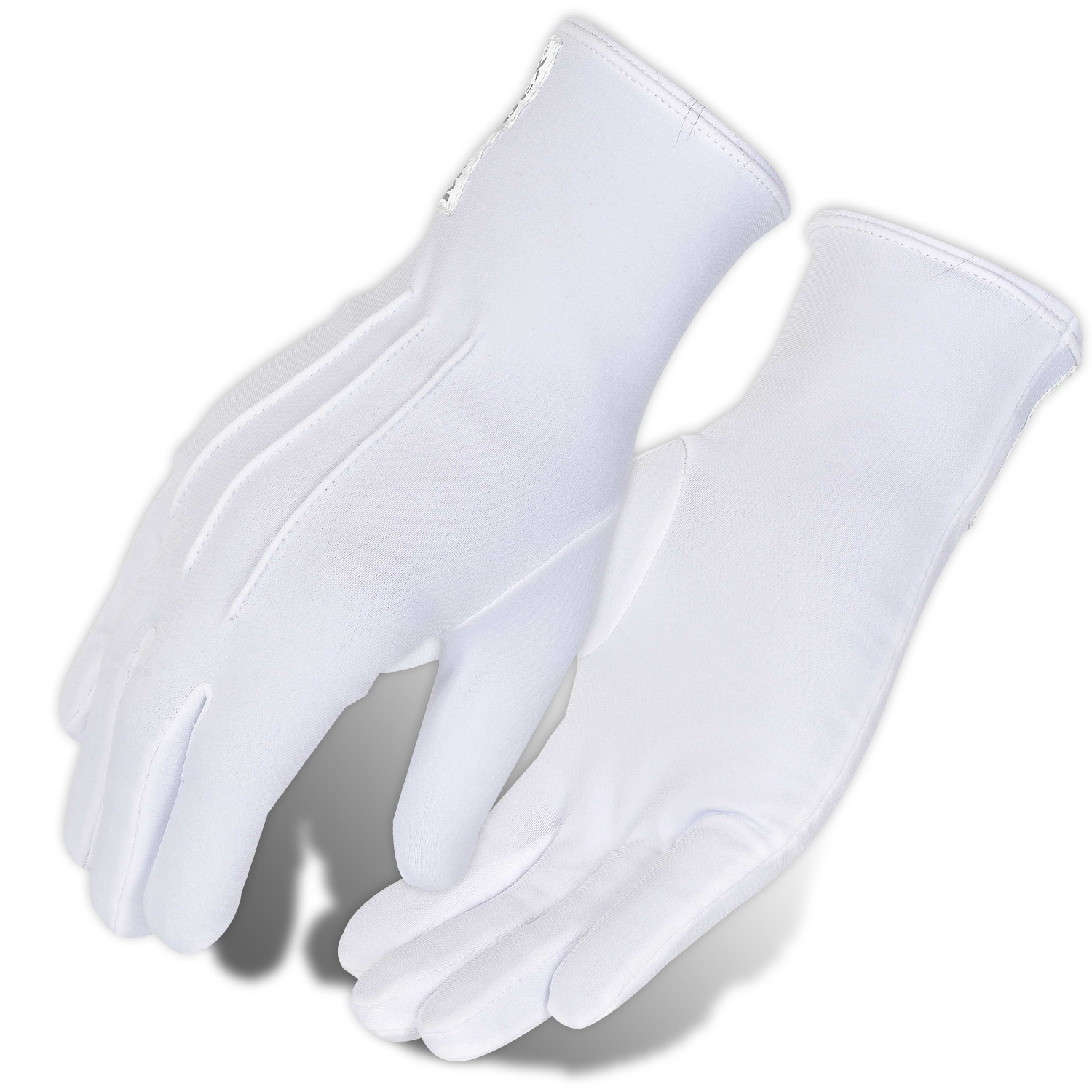 Classic parade gloves is crafted with polyester fabric and traditional stitching lines on the back of the hand, perfect for parade purposes. These slim-fitting gloves are made from stretchable and breathable fabric, offering optimal comfort. The seamless fourchettes construction and ergonomic thumb construction ensure a seamless and ergonomic fit.