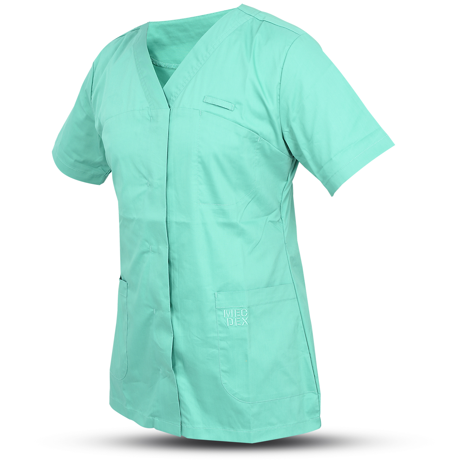 fabric with stretch, it features a full snap-button front closure, V-neck design, and multiple practical pockets —