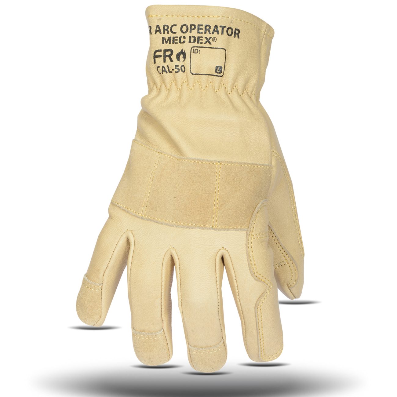 FR Arc Operator with its exceptionally durable, comfortable, and washable premium goatskin leather palm, which is tanned in a fire-resistant chemical recipe. The original leather palm reinforcement with a unique stitching pattern offers unrivaled comfort and dexterity with better tear resistance features. Back of hand handmade with the same goatskin leather. Cowhide Split leather knuckles give protection at the back zone of the hand. A MECDEX® logo & and performance rating mark on the back cuff.