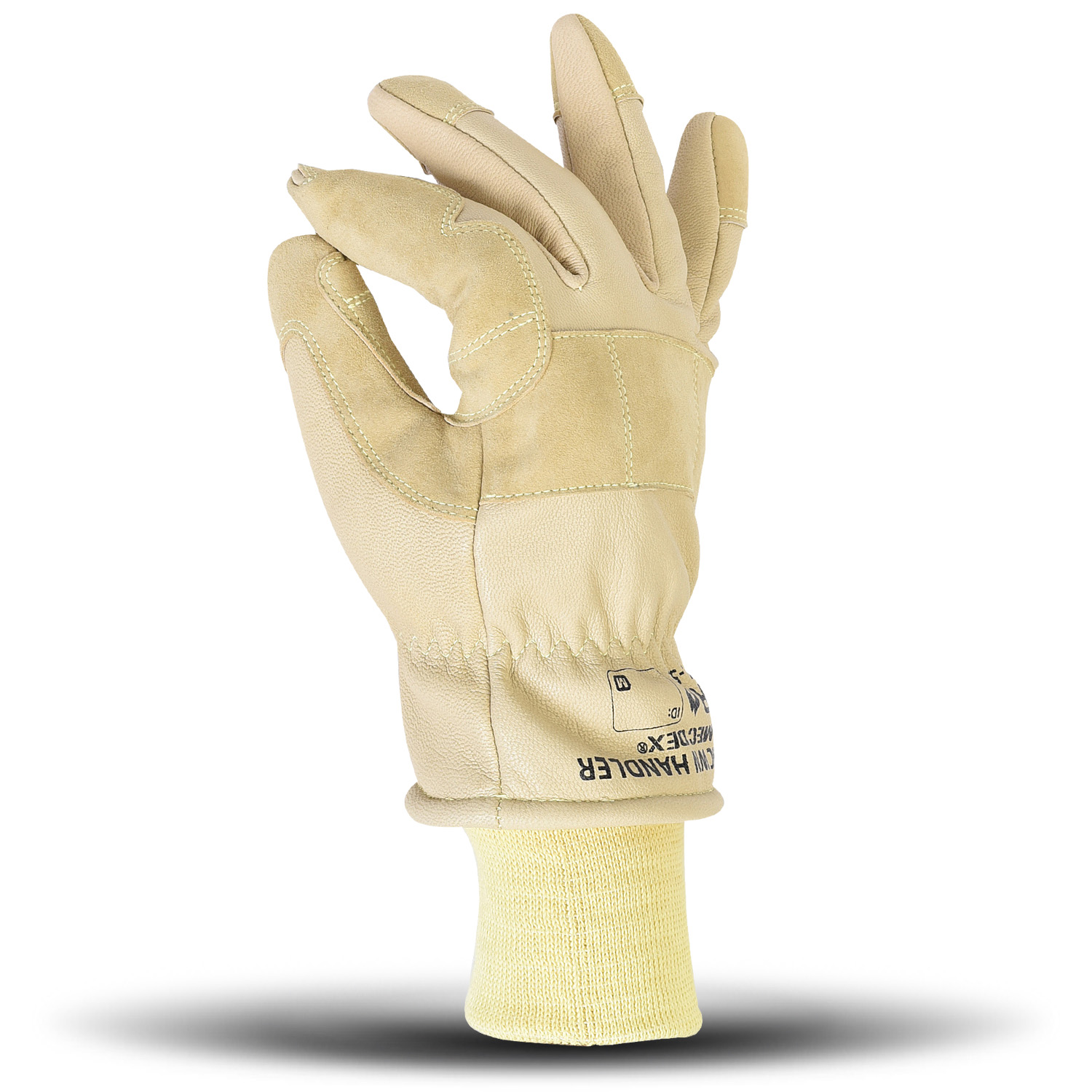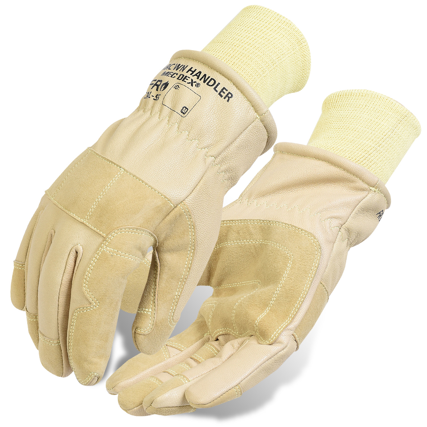 FR Arc WN Handler winter gloves with their exceptionally durable, comfortable, and washable premium goatskin leather palm, which is tanned in a fire-resistant chemical recipe. The original leather palm reinforcement with a unique stitching pattern offers unrivaled comfort and dexterity with better tear resistance features. Back of hand handmade with the same goatskin leather. Cowhide split leather knuckles give protection at the back zone of the hand. A MECDEX® logo & and performance rating mark on the back cuff. Gloves completely lined with FR Thinsulate™ & water barrier provide a warm feel while working in outdoor cold weather conditions.