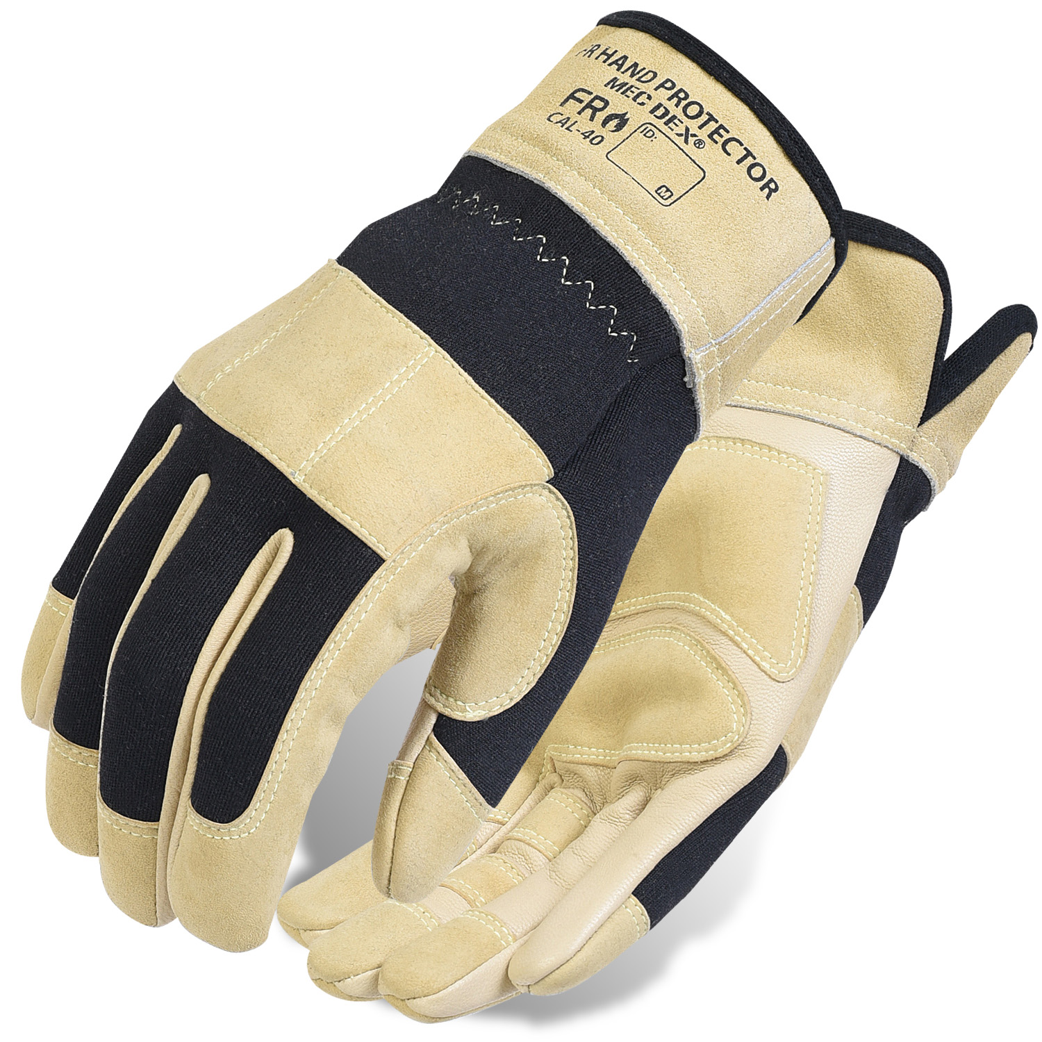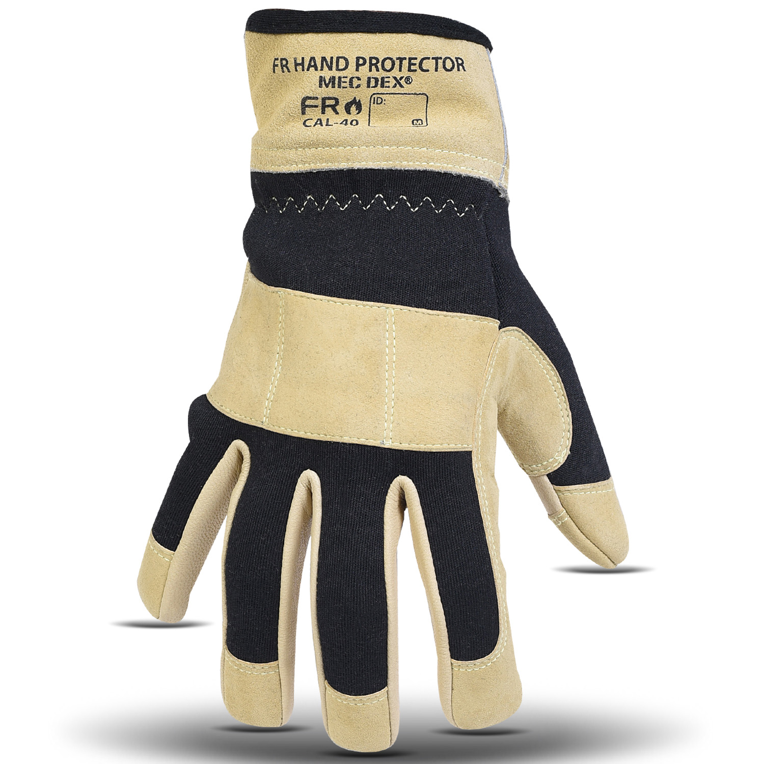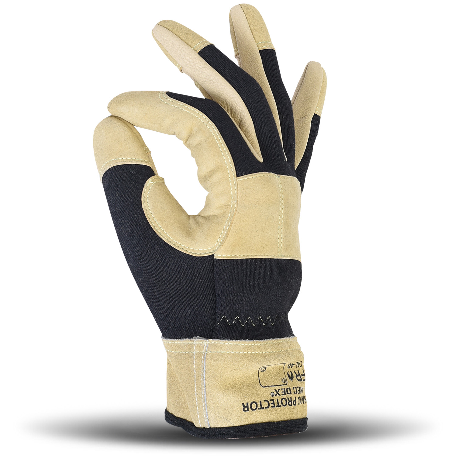 FR Hand Protector with its exceptionally durable, comfortable, and washable premium goatskin leather palm, which is tanned in a fire resistance chemical recipe, and its complete lining made with Kevlar® fiber that enhances the overall cut and FR performance of this glove. The original leather palm reinforcement with a unique stitching pattern offers unrivaled comfort and dexterity with better tear resistance features. The back of the hand is made with FR fabric and the FR cowhide split leather knuckles give protection at all back zones of the hand. Cuff made with cowhide split leather with MECDEX® logo & and performance rating mark. “DuPont™ and Kevlar® are trademarks or registered trademarks of E.I. du Pont de Nemours and Company.”