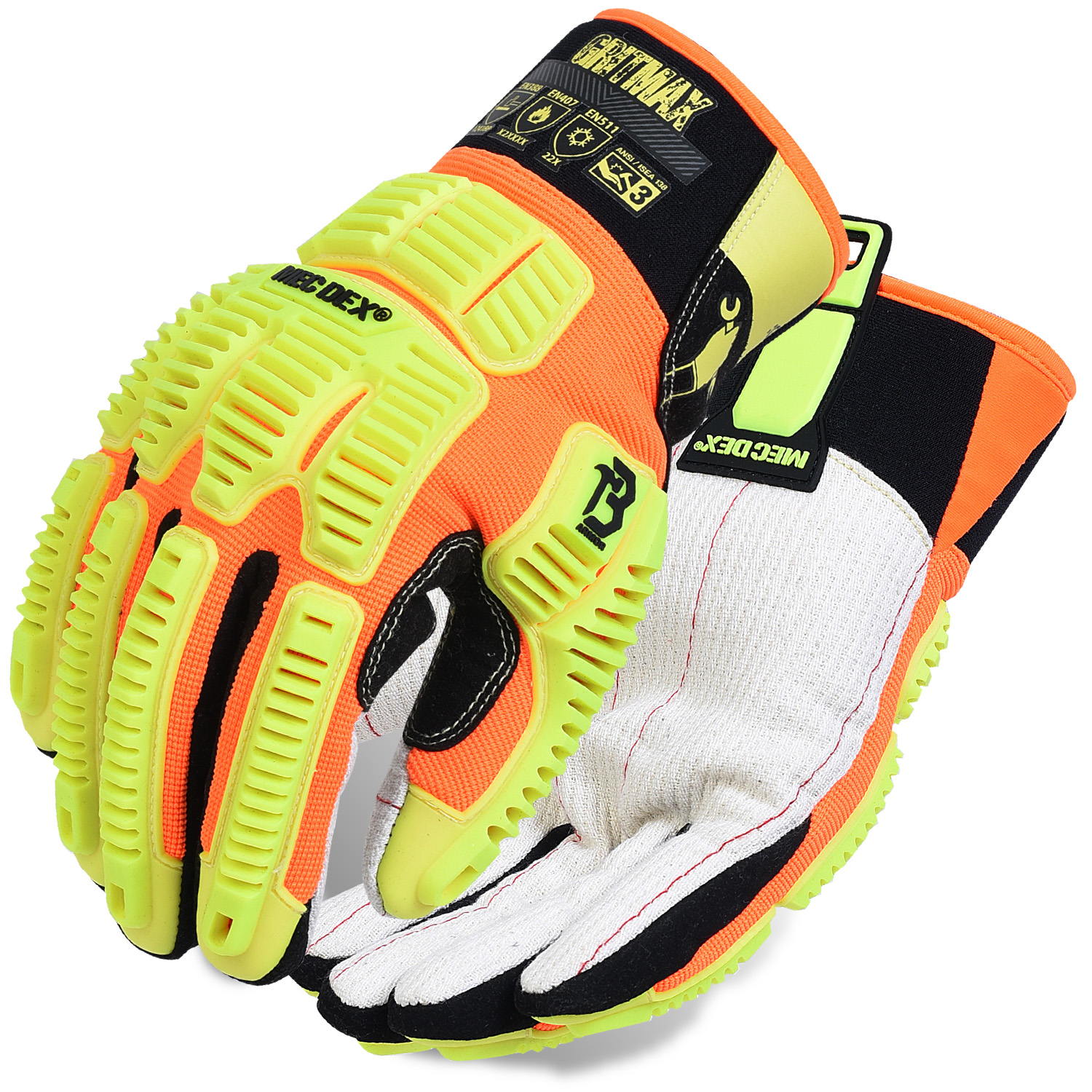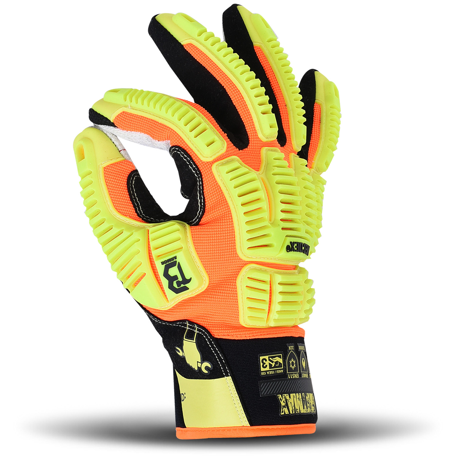 Engineered for the oil & gas field, these gloves feature Impact 3 stitched vinyl protection across fingers, knuckle, and dorsal for maximum safety. A silicon-printed WR synthetic leather palm with Cut A4 fabric reinforcement ensures grip and cut resistance, even in wet or oily conditions. With electro-conductive fingertips, elastic wrist, and carabiner hole, they deliver rugged, reliable performance.