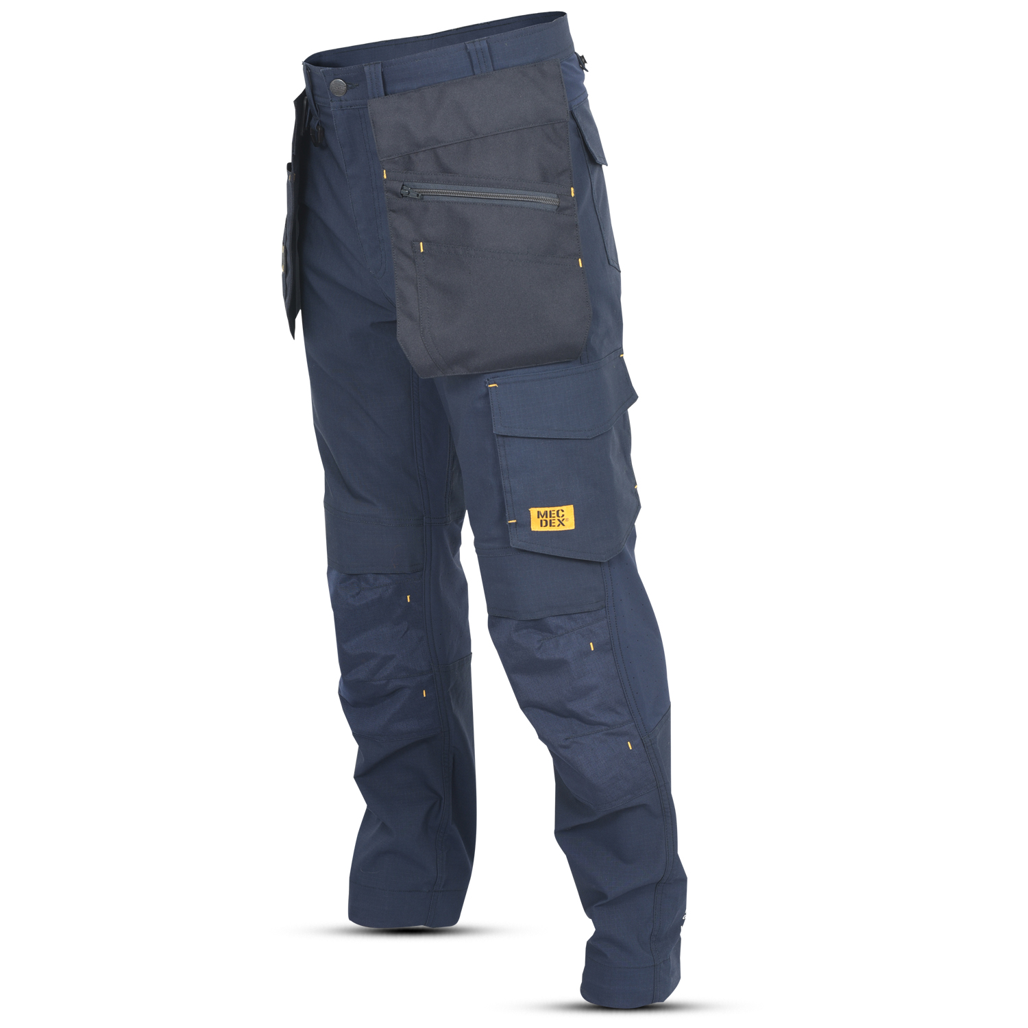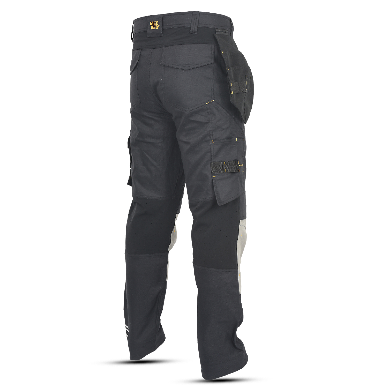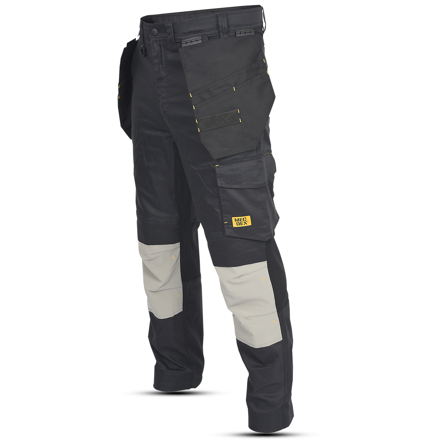 it features multiple pockets including optional holster attachments, bottom-loading knee pad pockets, and ventilated back panels.