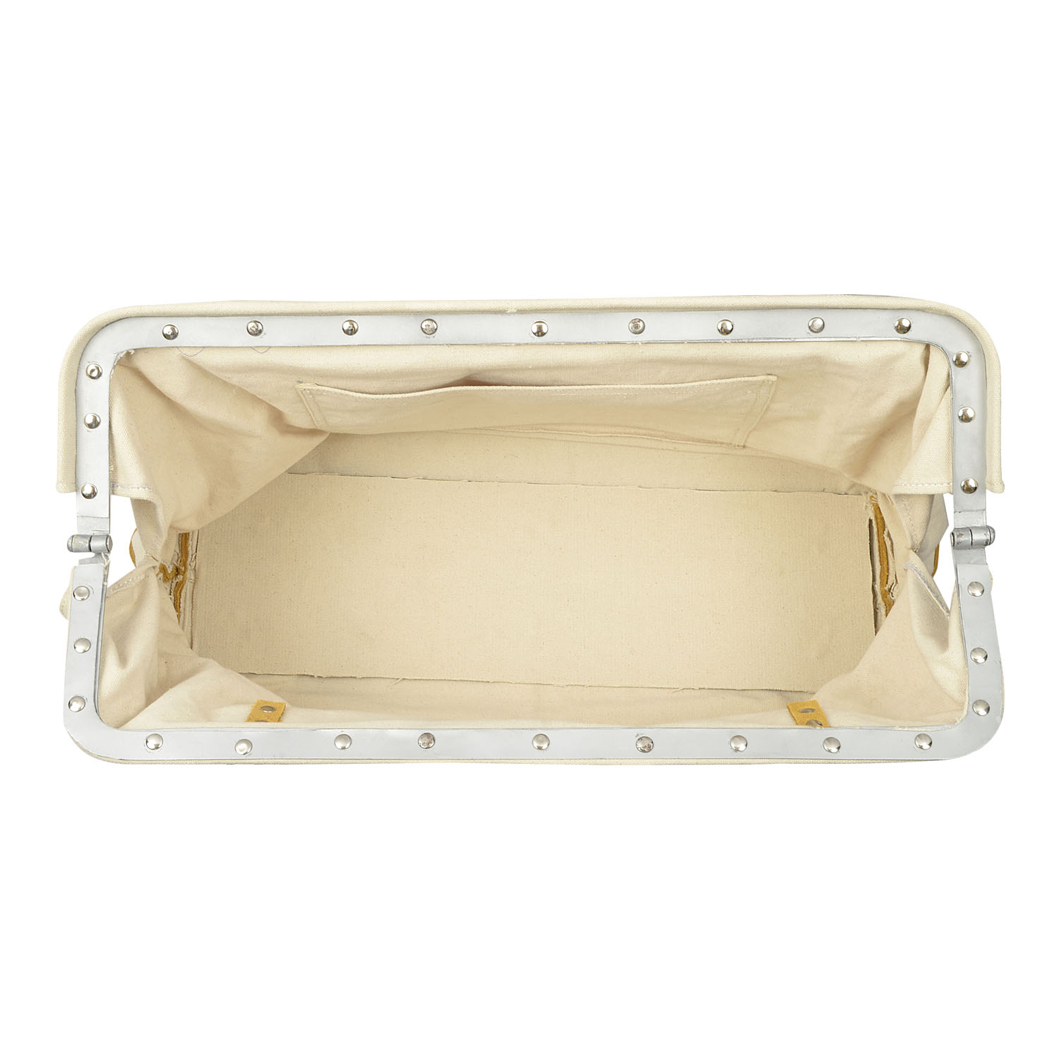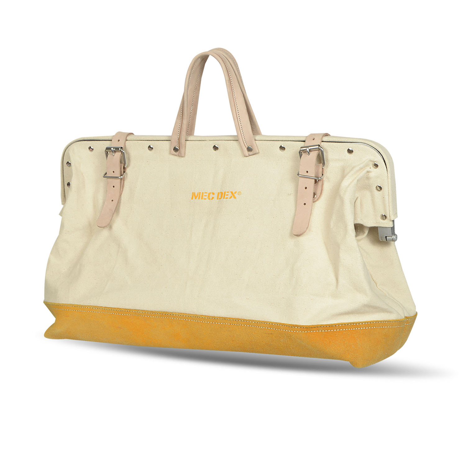 A top-notch mason’s tool bag with double-layer leather handles, straps, and a suede leather bottom for added strength and durability. It is composed of heavy-duty cotton canvas. This bag is having 11” by 9” large pocket. Mouth of this bag is closed with heavy gauge hinged steel frame for tight closure. Fiber board bottom shelf retains bag’s shape. 20” by 12” deep with split leather bottom reinforcement.