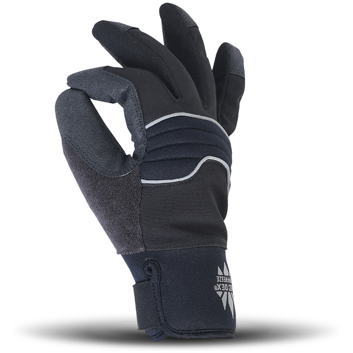 WR synthetic suede with reinforced nail tips, knuckle bendings, and foam-padded PVC knuckle protection provides durability and impact resistance. Thinsulate™ insulation, microfleece lining, and 4.0mm foam layer deliver high thermal retention, while a Cut-D palm liner enhances cut protection. Silicone-printed grip, Touch Pointer™ conductive index finger, and neoprene wrist ensure secure handling, flexibility, and reliable performance in extreme freezing conditions.