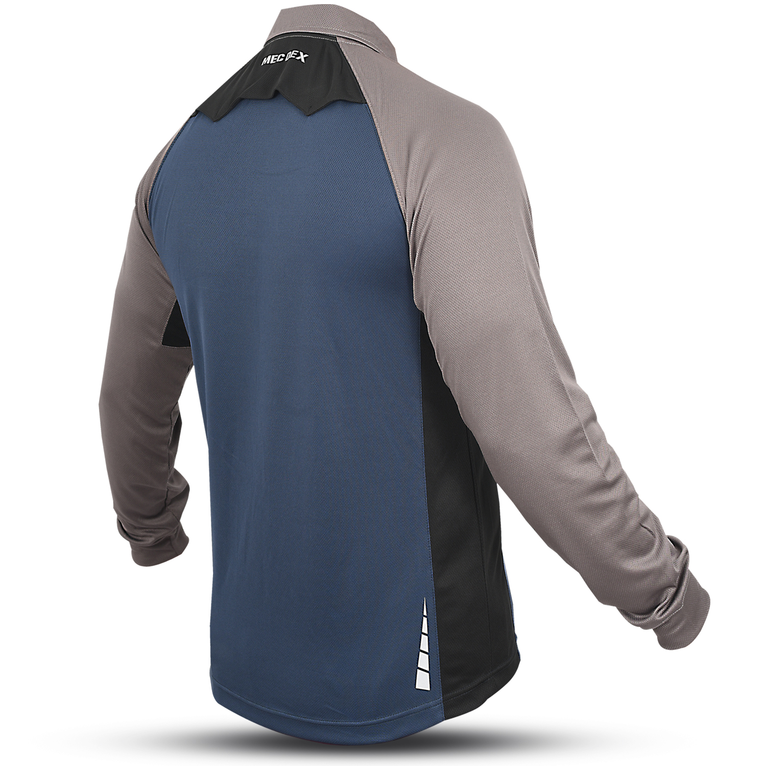 design, polo collar, raglan sleeves, long sleeves with ribbed cuffs, longer back hem, and a back mesh