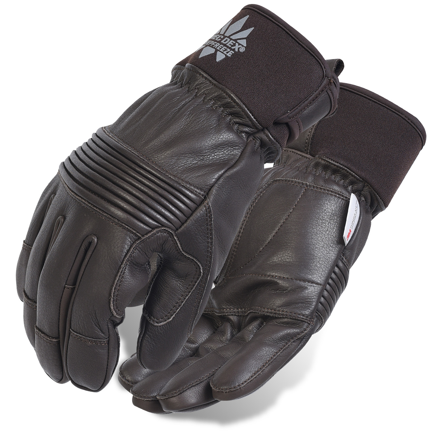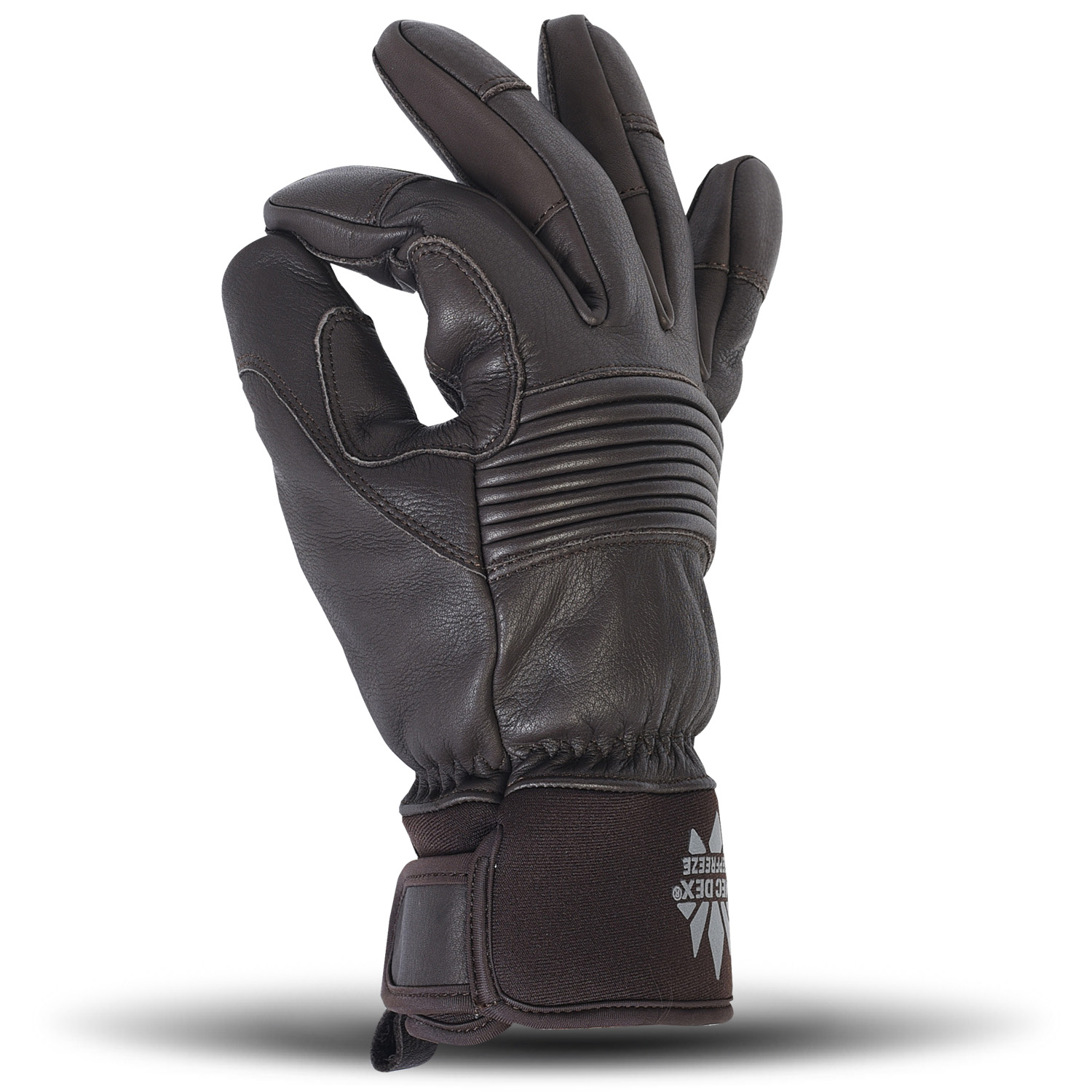 WR cowhide leather provides durability and strength, complemented by foam-padded knuckle ribs for added protection in harsh cold environments. Thinsulate™ insulation with a microfleece lining keeps hands exceptionally warm, and the gloves are designed to be integrated with freezer jackets for complete thermal coverage. A nylon-over-neoprene cuff, elastic wrist, and hook-and-loop strap ensure a secure, adjustable fit, while the synthetic leather pull tab and spandex gusset enhance grip, comfort, and resistance against extreme cold.