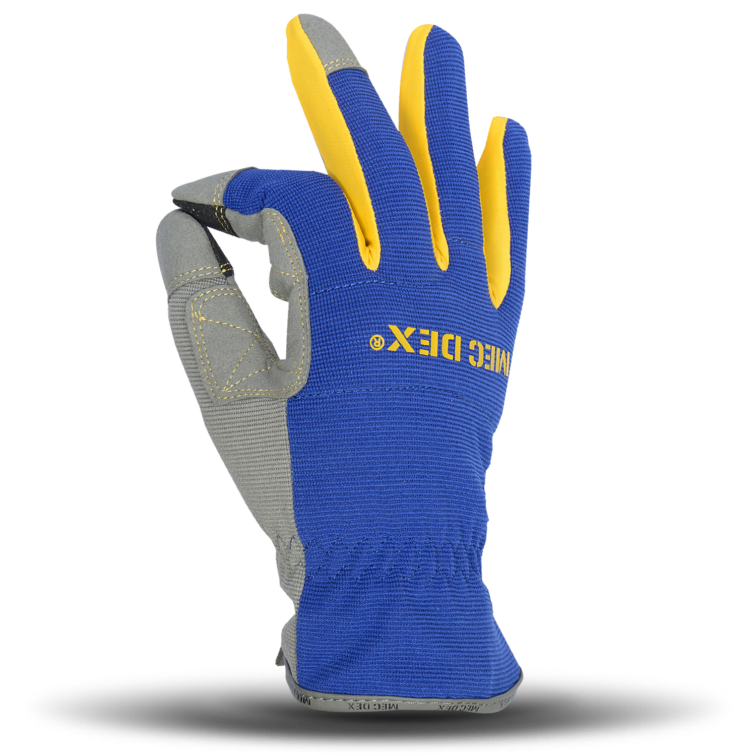 Durable slip on style for a variety of projects around your home, works with all touch phone or touch devices. Electro conductive synthetic leather tips on front thumb & index finger enables contact between finger and touch devices. Durable synthetic leather base palm with foam padding. Unlined spandex fabric backing with contrast yellow color lightweight stretchable spandex fabric fourchettes. Foam padded knuckle protection. Synthetic leather crotch stitched with contrast yellow color thread. Vintage synthetic leather puller on front cuff that makes your gloves easy to pull on.